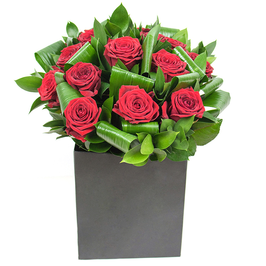 Enhance your living space with our Graceful Red Rose Bouquet. Featuring stunning red roses, vibrant aspidistra leaves, and elegant ruscus, this arrangement is a beautifully unique addition to any home.