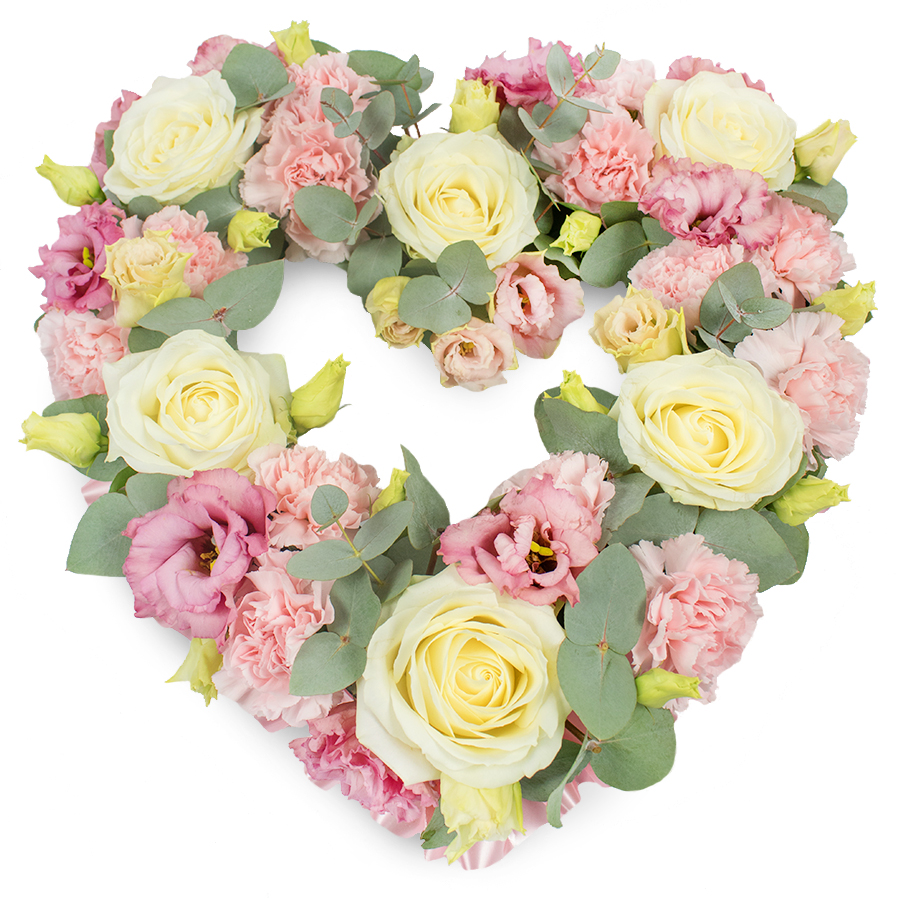 Pay your respects with our refined memorial flower arrangement, elegantly designed to honor the memory of your loved one. This beautiful bouquet showcases a harmonious blend of white roses, pink carnations, pink lisianthus, and eucalyptus leaves, all carefully hand-picked for their exceptional freshness and quality.